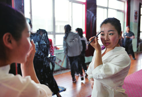 如今的太雨琴是一名北路梆子劇團的演員,隨著走向社會,她越發(fā)感覺到肩頭的重任。傳統(tǒng)戲劇,尤其是北路梆子這樣的地方少數(shù)劇種,那種萬人爭睹的景象已經一去不復返了?,F(xiàn)在除了一些縣鄉(xiāng)的節(jié)日慶典,很少有人愿意花錢到劇場觀看。這樣一來,北路梆子也就面臨著演出市場萎縮、大量演員流失的狀況。與其說太雨琴在靠戲曲吃飯,不如說她在用信念堅持。(何光暉 攝影報道)