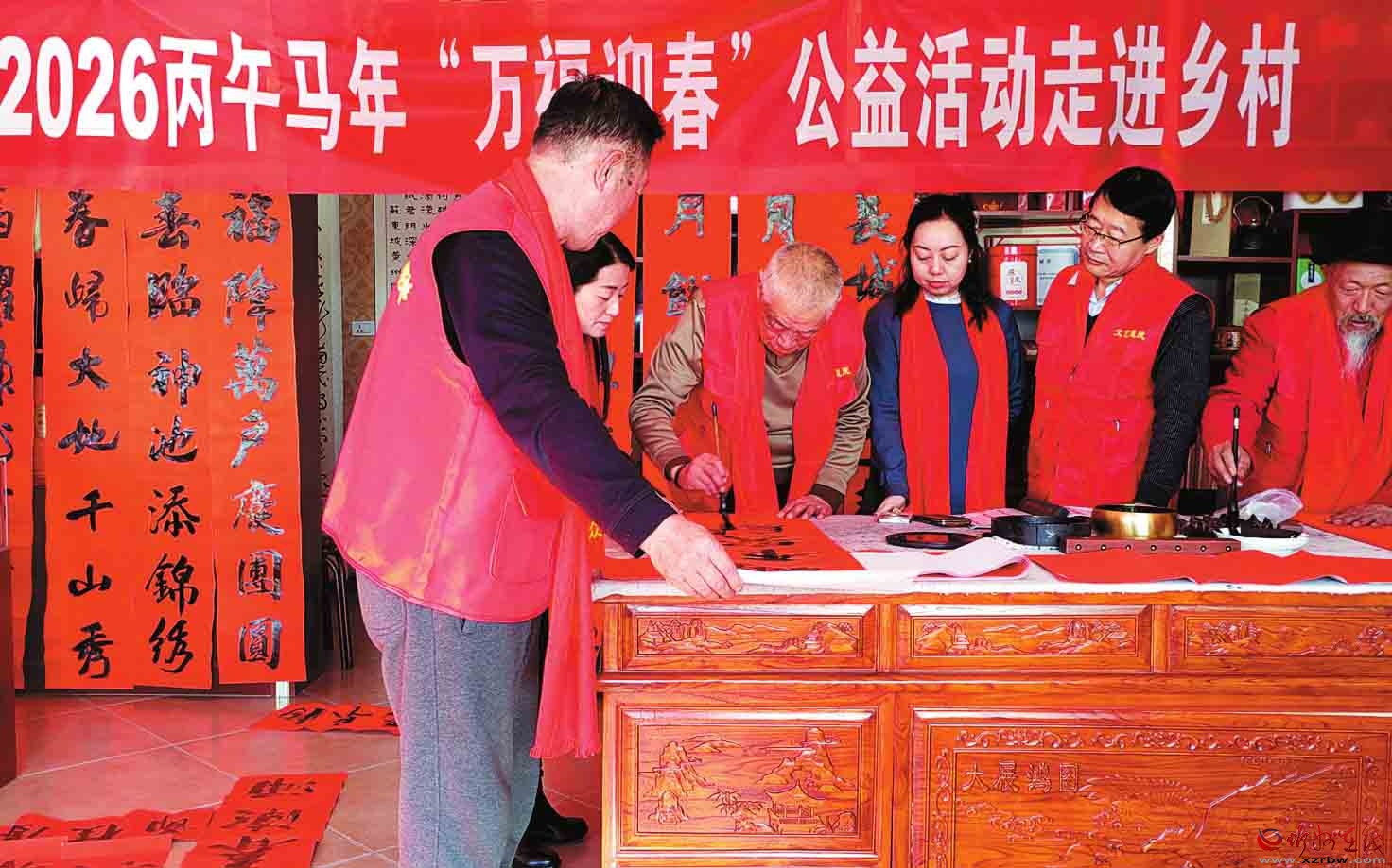 神池縣文聯(lián)、縣書法家協(xié)會積極響應(yīng)省市“萬福迎春走進(jìn)鄉(xiāng)村”公益活動(dòng)號召,發(fā)動(dòng)本地文學(xué)愛好者創(chuàng)作兼具地域風(fēng)情與年俗韻味的原創(chuàng)春聯(lián),近日,兩單位聯(lián)合組織書法愛好者深入鄉(xiāng)村,為村民義務(wù)書寫春聯(lián)?;顒?dòng)現(xiàn)場墨香四溢,一幅幅帶著鄉(xiāng)土溫度的春聯(lián)紅遍村頭巷尾,暖心舉措深受群眾交口稱贊。(楊晉明攝)