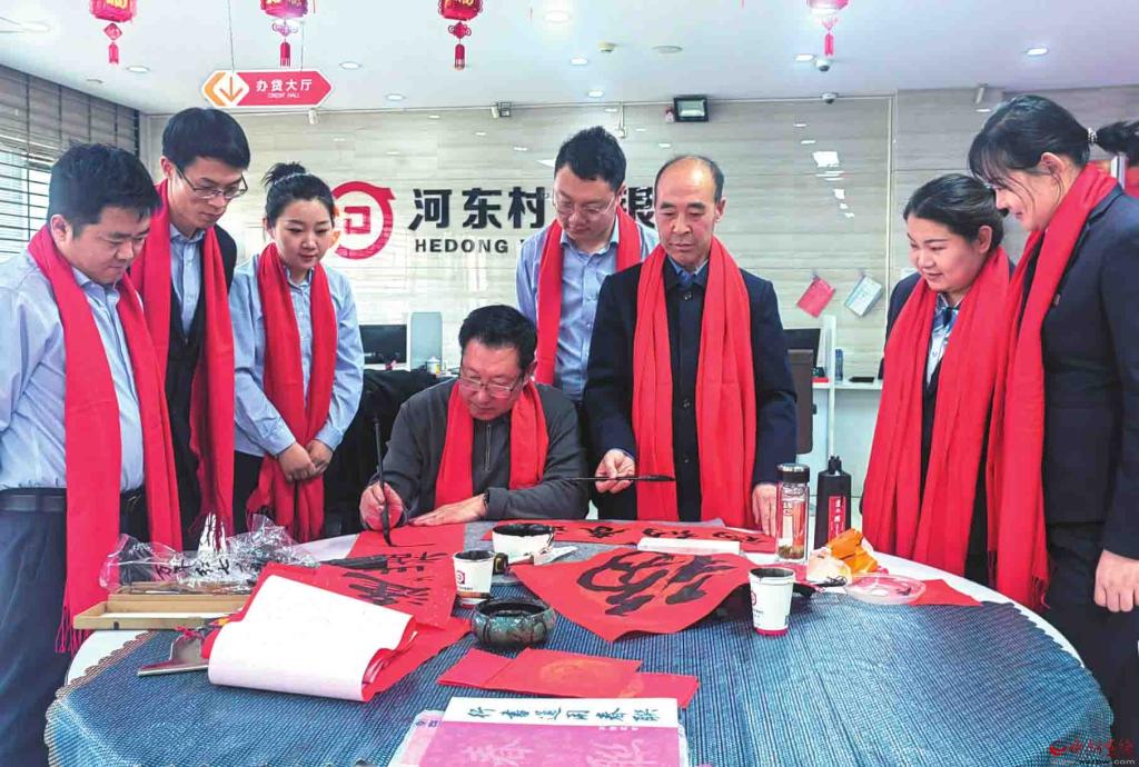 新春到來之際,神池縣河東村鎮(zhèn)銀行邀請當?shù)貢◥酆谜咴跔I業(yè)大廳現(xiàn)場揮毫潑墨,為前來辦理業(yè)務的客戶書寫春聯(lián),深受群眾稱贊。(楊晉明攝)
