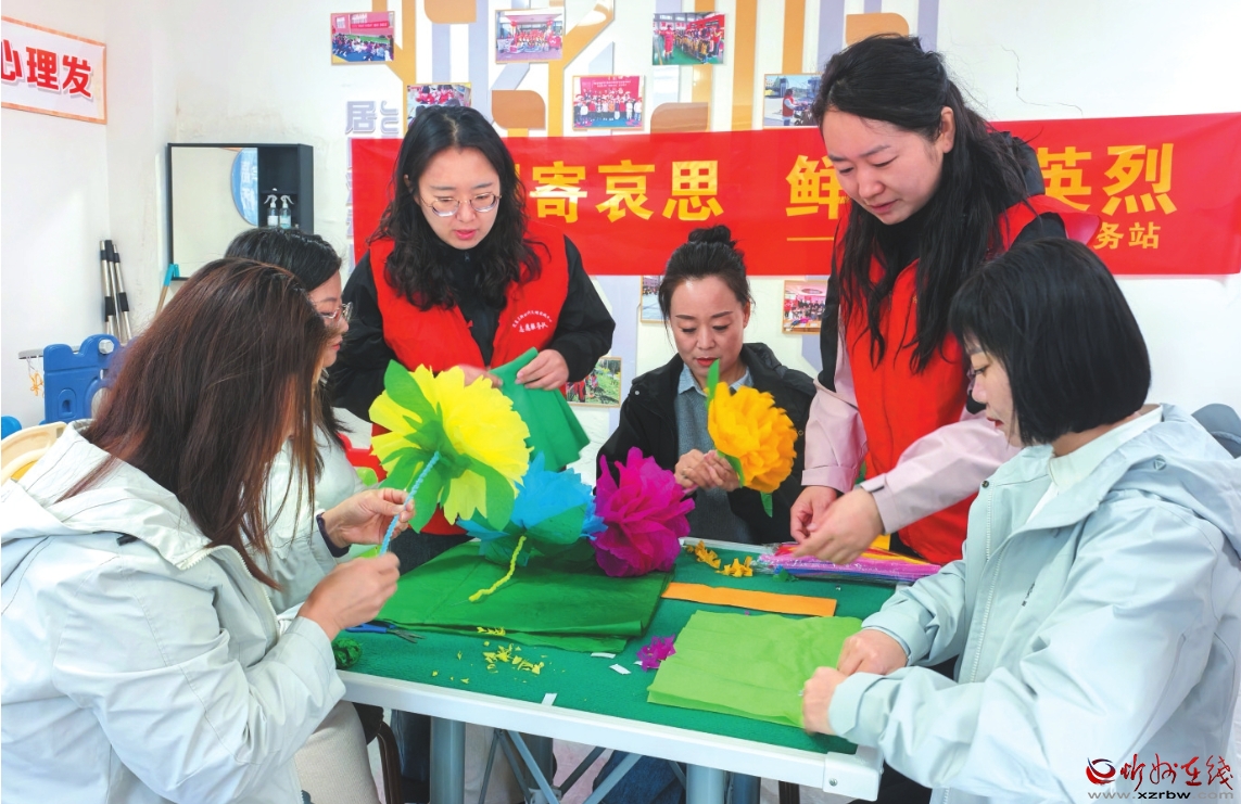 清明寄哀思,文明樹新風。定襄縣南城社區(qū)組織工作人員與社區(qū)居民手工制作祭祀花,并免費向社區(qū)居民發(fā)放,引導大家摒棄燒紙陋習,以環(huán)保、溫情的方式追思先人。圖為社區(qū)工作人員與居民一同制作手工祭祀花。 (郭婧蕾攝)