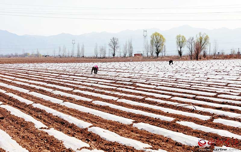 4月9日,定襄縣留念村村民搶抓農時,栽種西瓜苗、搭建瓜架,田間一派繁忙的春耕景象。(