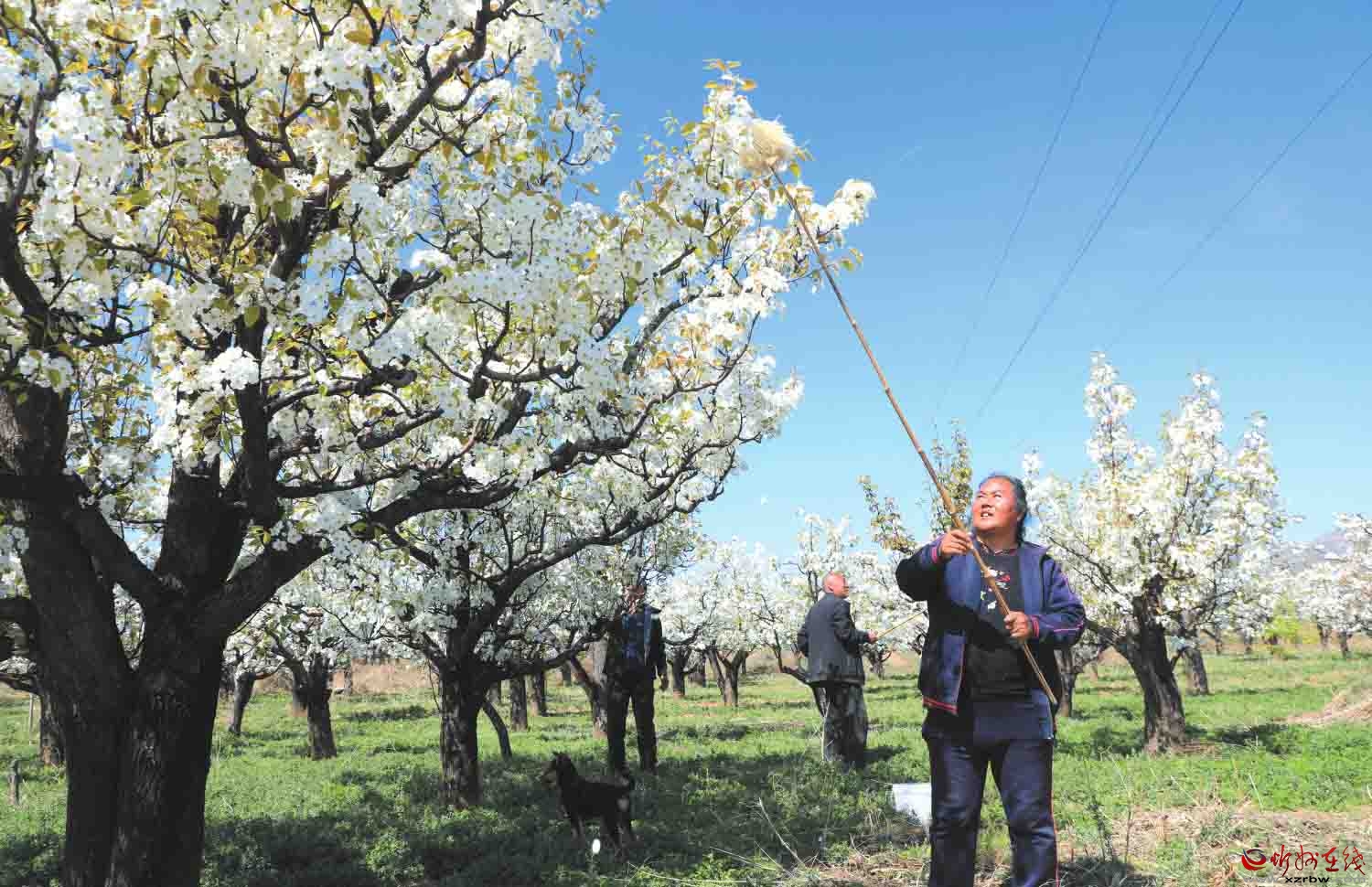 4月18日,原平市同川鎮(zhèn)萬(wàn)畝梨園迎來(lái)盛花期,果農(nóng)緊抓晴好天氣開(kāi)展人工授粉作業(yè),通過(guò)精準(zhǔn)點(diǎn)授提升坐果率,為秋季豐產(chǎn)奠定基礎(chǔ)。(褚 震攝)