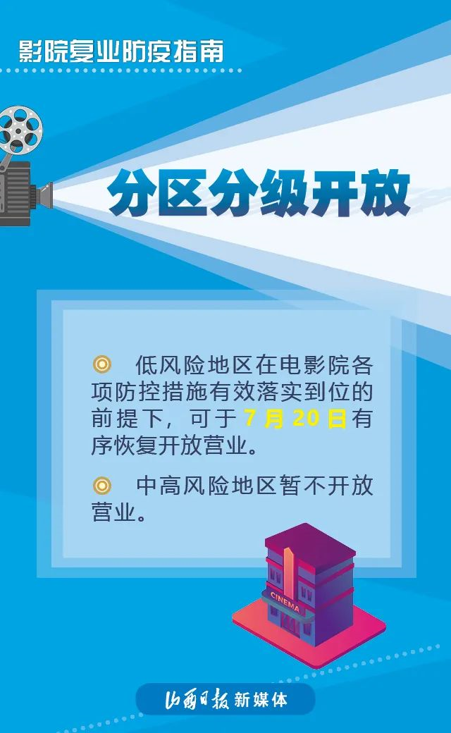 近日,國家電影局發(fā)布《關(guān)于在疫情防控常態(tài)化條件下有序推進(jìn)電影院恢復(fù)開放的通知》稱,低風(fēng)險(xiǎn)地區(qū)在電影院各項(xiàng)防控措施有效落實(shí)到位的前提下,可于7月20日有序恢復(fù)開放營業(yè)。具體要求如下↓↓↓