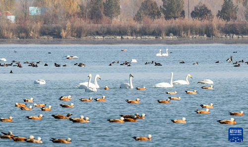 入冬以來,大批候鳥陸續(xù)飛抵位于甘肅省張掖市的張掖黑河濕地國家級自然保護區(qū)高臺段休憩覓食。作為全球9條候鳥遷徙通道之一的中亞通道的重要中轉(zhuǎn)站,每年約有18萬至25萬只水禽在張掖黑河濕地國家級自然保護區(qū)集結(jié)、停歇。