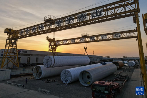 11月20日,在甘肅省酒泉經(jīng)濟技術(shù)開發(fā)區(qū)的中國水電四局(酒泉)新能源裝備有限公司裝運生產(chǎn)線上,工作人員進行風機塔筒吊裝作業(yè)(無人機照片)。(新華社記者 郎兵兵 攝)