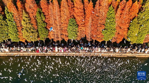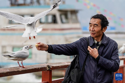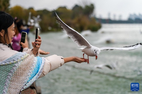 12月11日,游客在滇池畔的海埂東碼頭喂紅嘴鷗。(新華社記者 彭奕凱 攝)
