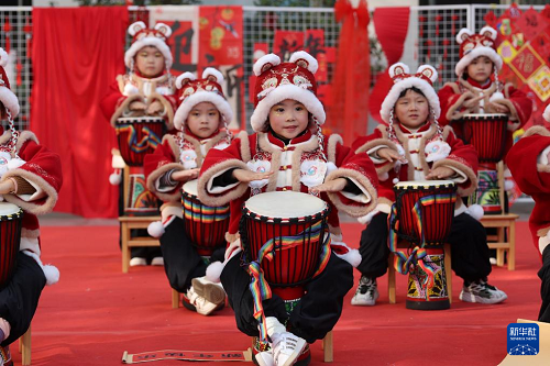 12月30日,在浙江省溫嶺市級(jí)機(jī)關(guān)幼兒園,孩子們與舞獅互動(dòng)。(新華社發(fā) 徐偉杰 攝)