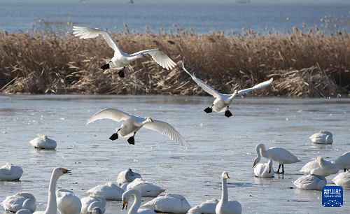 1月5日,大天鵝在榮成大天鵝國家級自然保護區(qū)棲息。(新華社記者 徐速繪 攝)