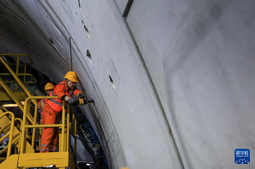 1月6日,中鐵十四局施工人員在“深江1號(hào)”盾構(gòu)機(jī)上進(jìn)行管片螺栓緊固工作。(新華社記者 毛思倩 攝)