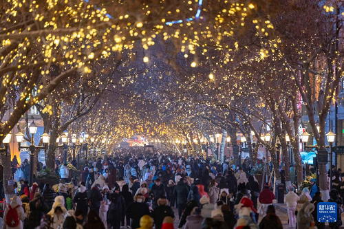 時下,“冰城”哈爾濱正值冰雪旅游季。夜幕降臨,百年老街中央大街被璀璨燈火點亮,游客置身其中,仿佛步入流動的冰雪藝術長廊,令人流連忘返。