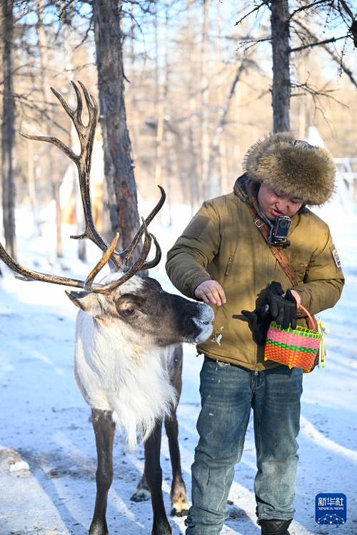 1月15日,游客在根河市敖魯古雅鄂溫克民族鄉(xiāng)敖魯古雅使鹿部落景區(qū)與馴鹿互動(dòng)。(新華社記者 徐嘉懿 攝)