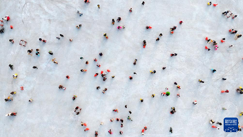 1月17日,市民在銀川文旅集團(tuán)覽山公園落日冰場玩耍(無人機(jī)照片)。(新華社記者 王鵬 攝)