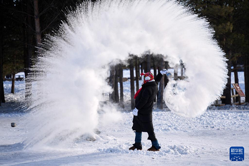 1月29日,在漠河北極村景區(qū)內(nèi)的北極沙洲,游客體驗“潑水成冰”。(新華社記者 王祚 攝)