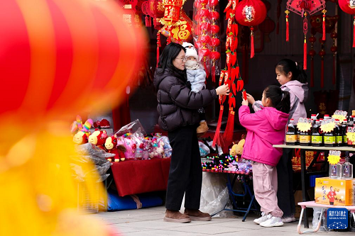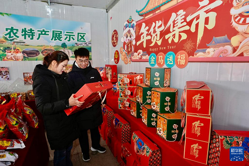 2月3日,游客在寧夏固原市西吉縣年貨大集上選購(gòu)年貨產(chǎn)品。(新華社記者 楊植森 攝)