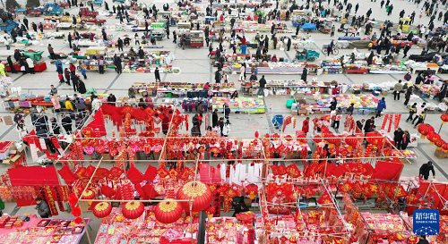 2月4日,在甘肅省臨夏回族自治州永靖縣劉家峽鎮(zhèn)年貨市場(chǎng),人們選購年貨(無人機(jī)照片)。(新華社發(fā) 史有東 攝)
