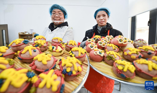 2月4日,在河南省洛陽市西工區(qū)紅山街道棗園社區(qū)花饃工坊內(nèi),工人展示制作好的花饃。(新華社發(fā) 黃政偉 攝)
