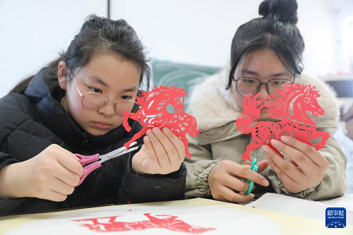 2月8日,河南省焦作市溫縣的學(xué)生在一家培訓(xùn)班學(xué)習(xí)制作“馬”剪紙作品。(新華社發(fā) 徐宏星 攝)