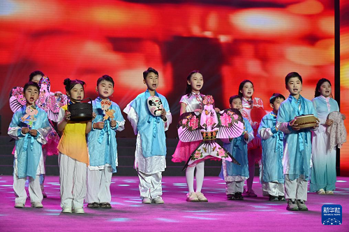 2月8日,在河南省沁陽市朱載堉音樂廳,小朋友們?cè)凇吧賰捍和怼鄙媳硌菁w詩朗誦《非遺里的中國》。(新華社發(fā) 楊帆 攝)