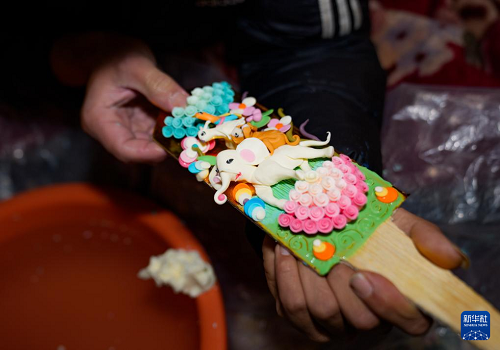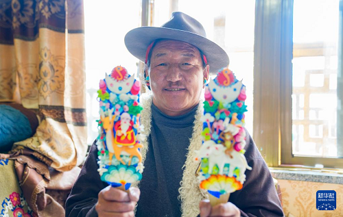 2月12日,在拉薩市林廓東路,來自西藏日喀則市仁布縣普松鄉(xiāng)的手工藝人羅布展示做好的酥油花。(新華社記者 丁增尼達 攝)