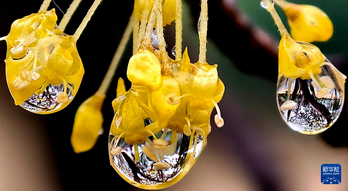 這是3月1日拍攝的河南省洛陽市街頭花朵上的雨珠。(新華社發(fā) 高山岳 攝)