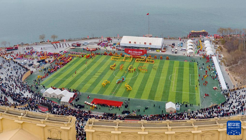 3月1日,在寧夏銀川市覽山公園,參賽社火隊的演員在比賽中(無人機(jī)照片)。(新華社記者 馬思嘉 攝)