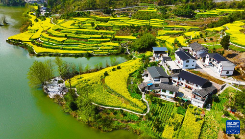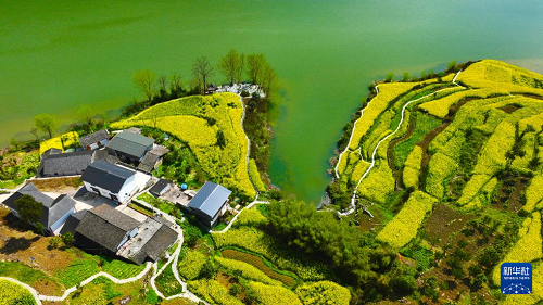 重慶市黔江區(qū)阿蓬江鎮(zhèn)大坪村油菜花開放(3月4日攝,無(wú)人機(jī)照片)。(新華社發(fā) 楊敏 攝)