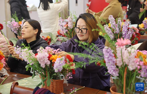3月8日,在山東省臨沂市沂南縣張莊鎮(zhèn)新時(shí)代文明實(shí)踐活動(dòng)中心,婦女參加插花藝術(shù)比賽。(新華社發(fā) 王彥冰 攝)