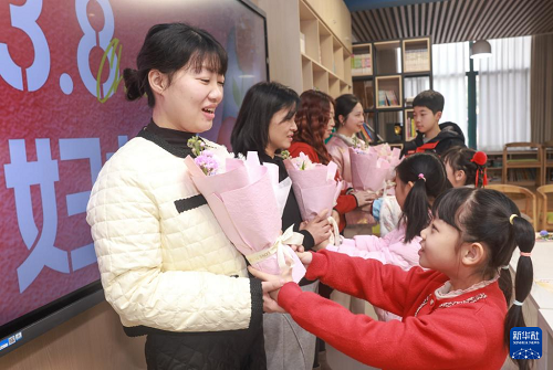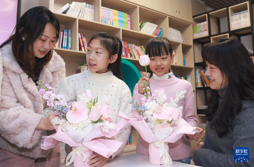 3月8日,在武漢市洪山區(qū)未來(lái)實(shí)驗(yàn)小學(xué)美林校區(qū),小學(xué)生為媽媽送上節(jié)日鮮花。(新華社發(fā) 趙軍 攝)