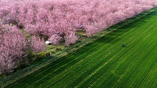 3月11日拍攝的西安市鄠邑區(qū)甘河街道丁村的梅花種植園(無(wú)人機(jī)照片)。(新華社記者 鄒競(jìng)一 攝)