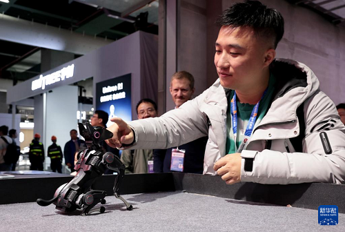 3月12日,參觀者在東方樞紐展區(qū)現(xiàn)場(chǎng)與一個(gè)名叫“哮天Sirius”的公斤級(jí)可訓(xùn)練機(jī)器狗互動(dòng)。(新華社記者 方喆 攝)