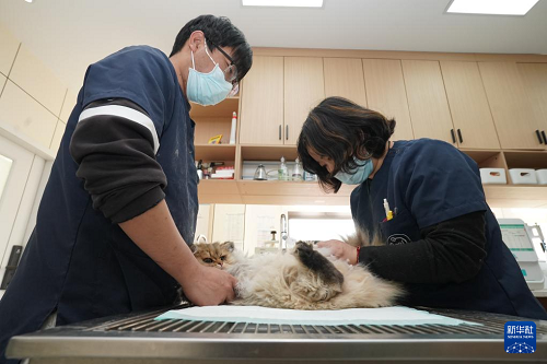 2月3日,在無(wú)錫關(guān)愛(ài)寵物醫(yī)院,醫(yī)護(hù)人員給寵物貓?zhí)昝?。(新華社發(fā) 劉臻睿 攝)