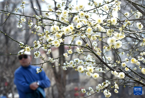3月16日,一名游客在北京明長城遺址公園欣賞綻放的梅花。(新華社記者 羅曉光 攝)
