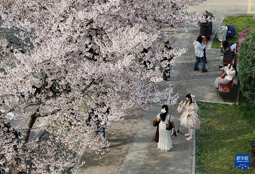 3月24日,游人在西安市雁塔區(qū)曲江池西路的櫻花樹下拍照、游玩(無人機(jī)照片)。(新華社記者 邵瑞 攝)