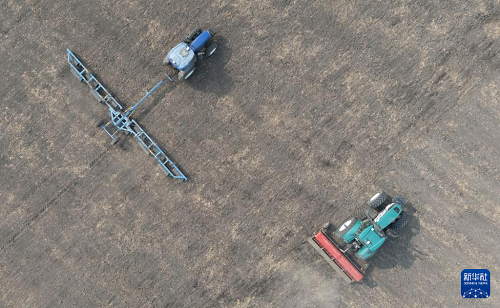 3月25日,農(nóng)機(jī)在位于黑龍江省哈爾濱市的北大荒集團(tuán)閆家崗農(nóng)場(chǎng)有限公司一處耕地上播種小麥(無(wú)人機(jī)照片)。(新華社記者 王松 攝)