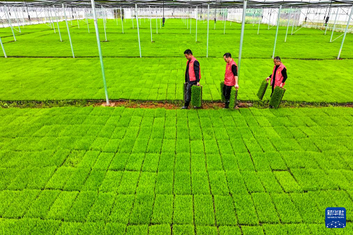 3月29日,農民在浙江省樂清市城東街道一處集中育秧點轉運水稻育秧盤。(新華社發(fā) 蔡寬元 攝)
