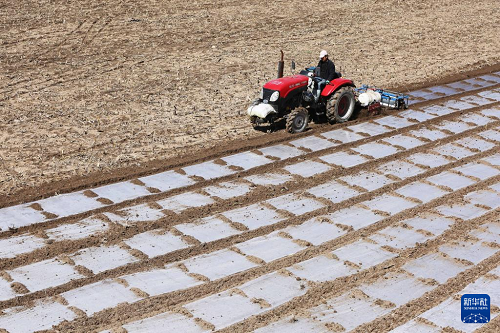 4月1日,農(nóng)機(jī)手駕駛農(nóng)機(jī)在甘肅省天水市武山縣馬力鎮(zhèn)的田間覆地膜。(新華社發(fā) 王克賢 攝)