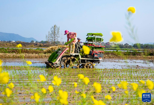 4月1日,江西省九江市都昌縣蔡嶺鎮(zhèn)楊灣村,農(nóng)民駕駛農(nóng)機(jī)在田間機(jī)插早稻。(新華社發(fā) 傅建斌 攝)