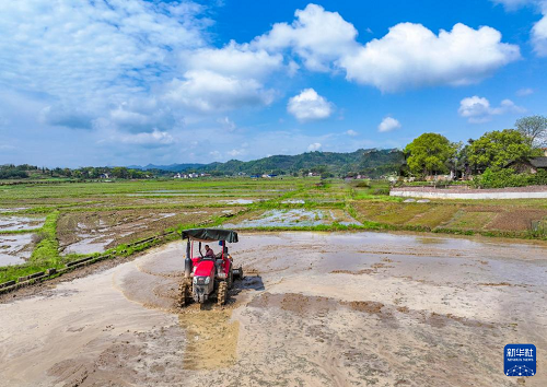 4月1日,湖南省常寧市蘭江鄉(xiāng)景星村,農(nóng)機(jī)手駕駛農(nóng)機(jī)翻耕農(nóng)田,準(zhǔn)備機(jī)插早稻秧苗(無人機(jī)照片)。(新華社發(fā) 周秀魚春 攝)
