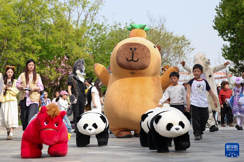 4月4日,游客在湖北省襄陽市華僑城奇幻谷景區(qū)觀看神奇動物大遷徙巡游表演。(新華社發(fā) 楊東 攝)