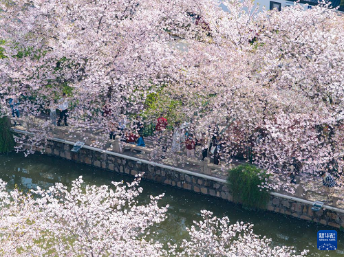 4月5日,人們在江蘇常熟市內(nèi)的護城河畔觀賞櫻花(無人機照片)。(新華社發(fā) 楊素平 攝)