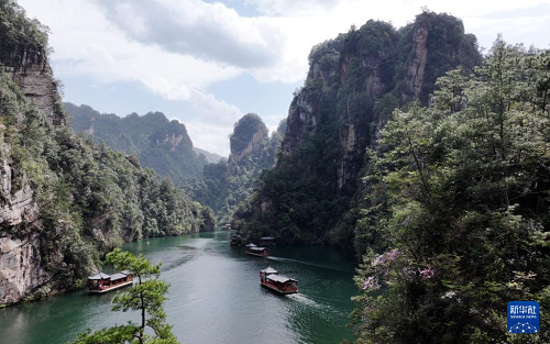 4月4日,游客乘船在湖南張家界寶峰湖景區(qū)游玩(無人機照片)。(新華社發(fā) 吳勇兵 攝)