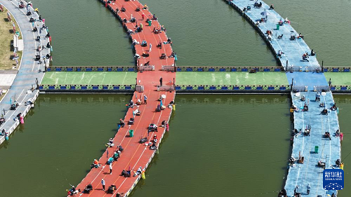 4月4日,垂釣愛好者在江蘇省泗洪洪澤湖國際垂釣中心大圓塘參加釣魚比賽(無人機照片)。(新華社發(fā) 許昌亮 攝)