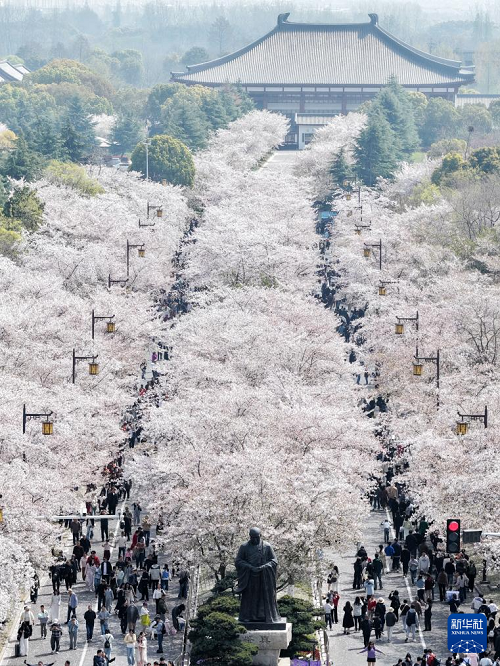 4月4日,游客在江蘇省揚州市鑒真路上的“櫻花大道”賞花游玩(無人機照片)。(新華社發(fā) 孟德龍 攝)