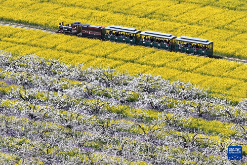 4月6日,游客乘觀光小火車從河北省晉州市周家莊鄉(xiāng)第九生產(chǎn)隊(duì)梨園旁經(jīng)過(無人機(jī)照片)。(新華社記者 楊世堯 攝)