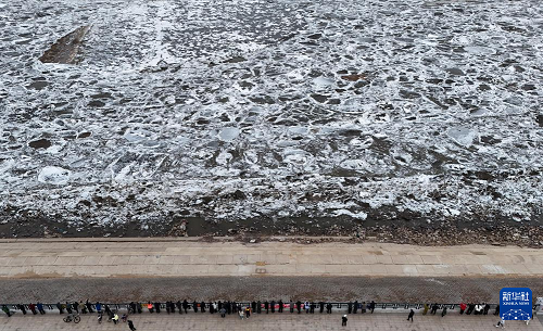4月12日,人們?cè)谟^賞松花江干流富錦段流冰景觀(無(wú)人機(jī)照片)。(新華社發(fā) 曲玉寶 攝)