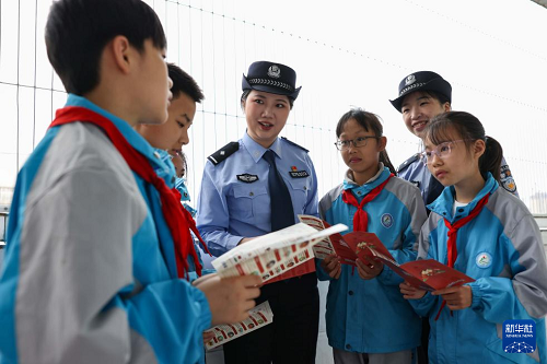 4月14日,在貴州省銅仁市玉屏侗族自治縣第四小學(xué),民警給學(xué)生講解國(guó)家安全知識(shí)。(新華社發(fā) 胡攀學(xué) 攝)