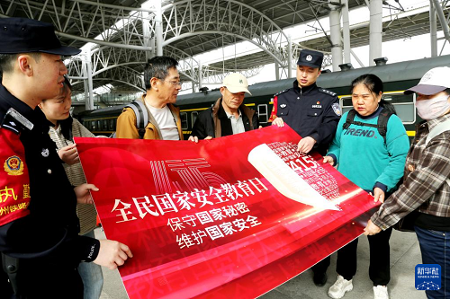 4月14日,江蘇徐州鐵路公安處連云港東站派出所民警為旅客講解國(guó)家安全知識(shí)。(新華社發(fā) 王春 攝)