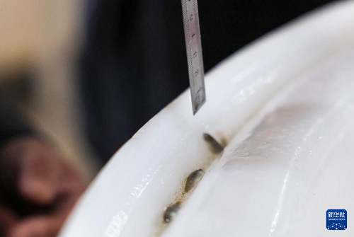 4月15日,工作人員在吉林延邊馬蘇大麻哈良種場繁育車間對魚苗進行檢測、計數(shù)。(新華社記者 顏麟蘊 攝)
