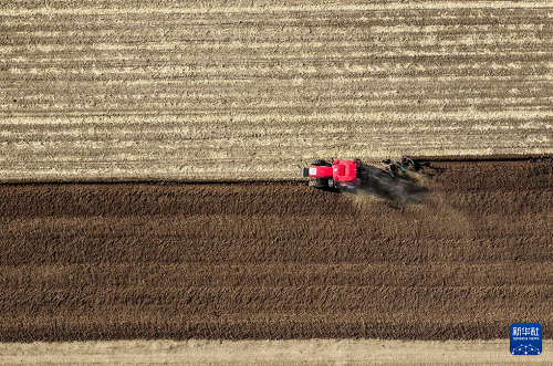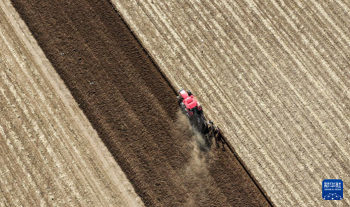 ?4月17日,在通遼市科爾沁左翼中旗花吐古拉鎮(zhèn),農(nóng)機手駕駛農(nóng)機翻地(無人機照片)。(新華社記者 連振 攝)