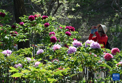 4月20日,游客在圓明園拍攝盛開的牡丹。(新華社記者 羅曉光 攝)